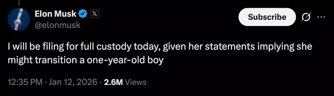 “I will be filing for full custody today, given her statements implying she might transition a one-year-old boy,” Musk tweeted today (January 12).