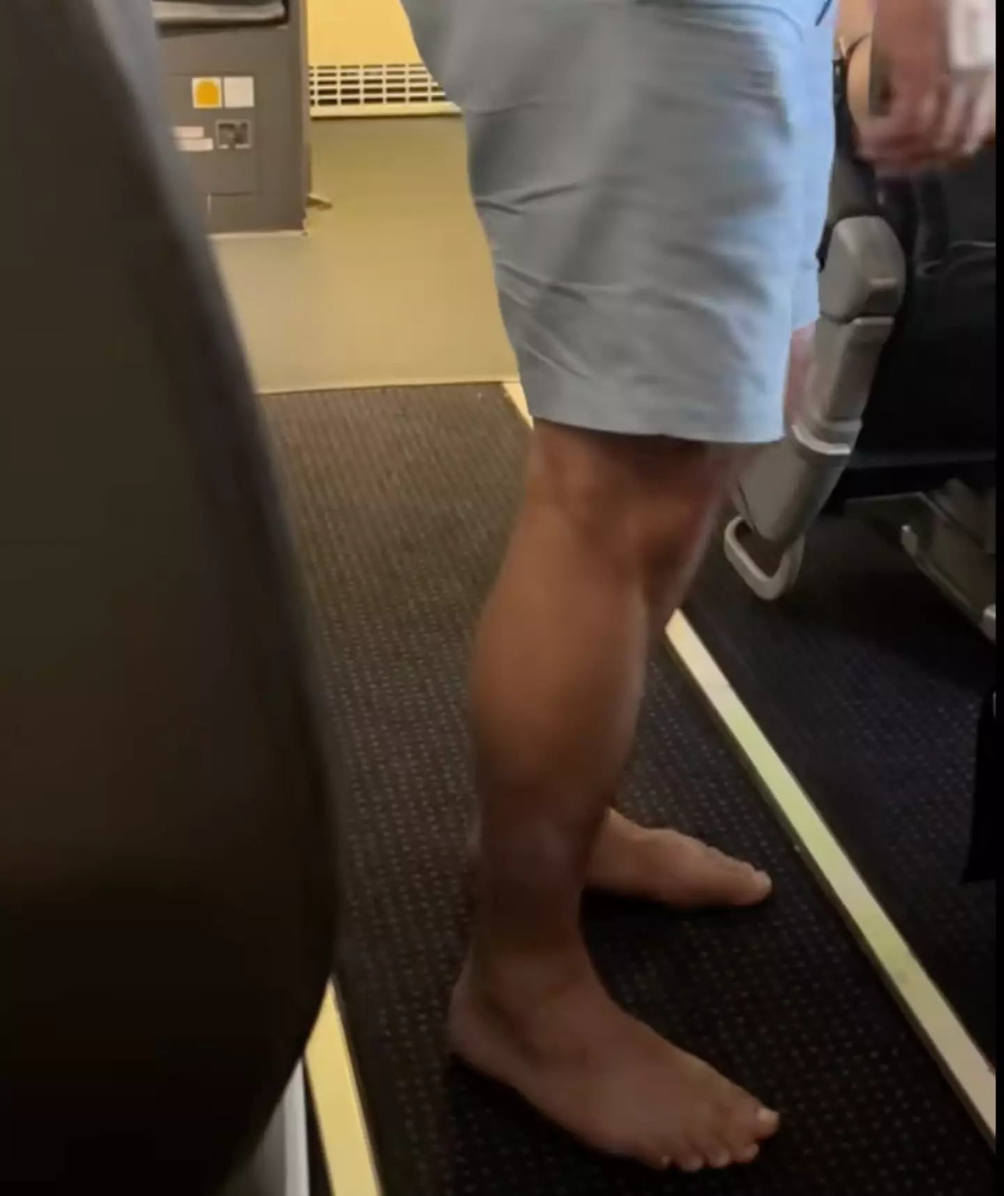 A TikTok video shared by Natalie Buffet captures a man walking out of the plane’s restroom completely barefoot.