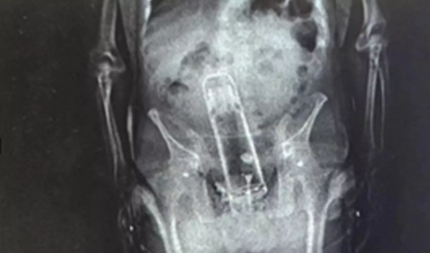 An X-ray conducted at the hospital showed a foreign object extending from his hip to his rib.