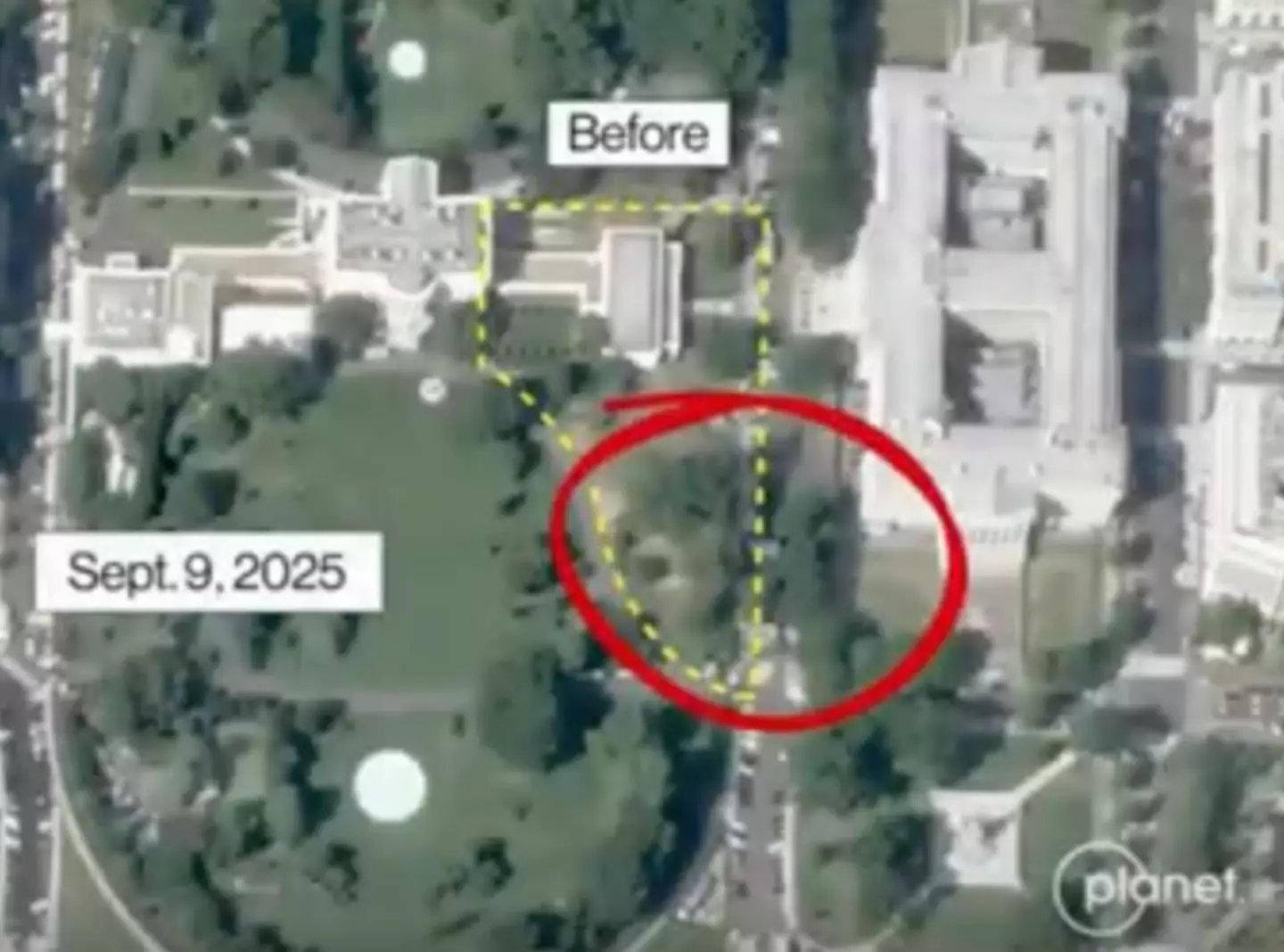 Images captured by satellite illustrate a vast cleared space following the East Wing demolition, with some trees also being removed.