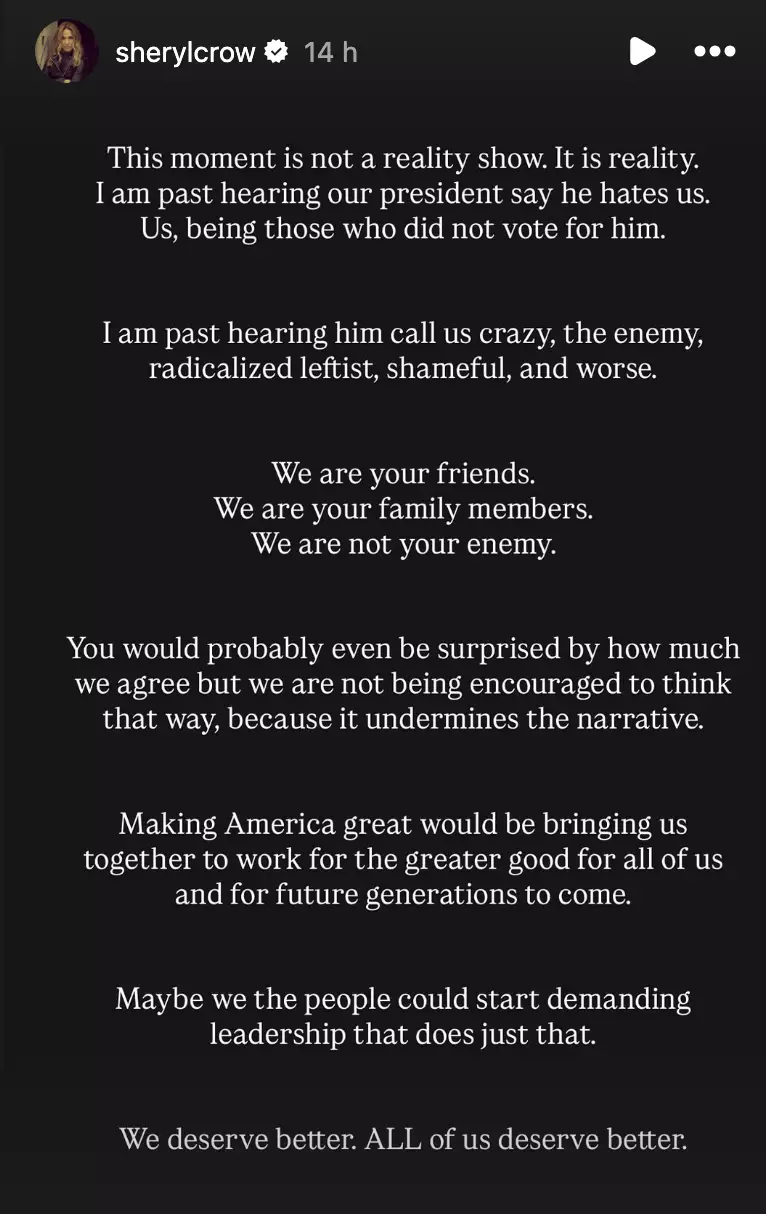 In part, Crow said: “I am past hearing our president say he hates us. Us, being those who did not vote for him.